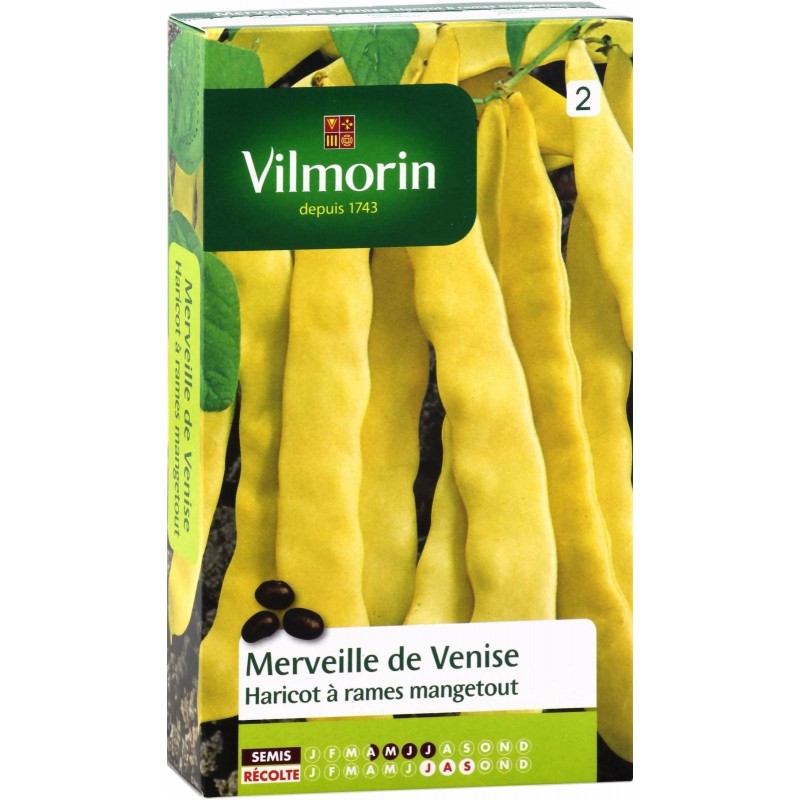 Merveille de Venise est une variété de haricot mangetout tardive, donnant de très belles gousses jaune d'or, longues de 20 cm en moyenne, plates et larges, absolument sans fil. Son grain est couleur lie de vin.