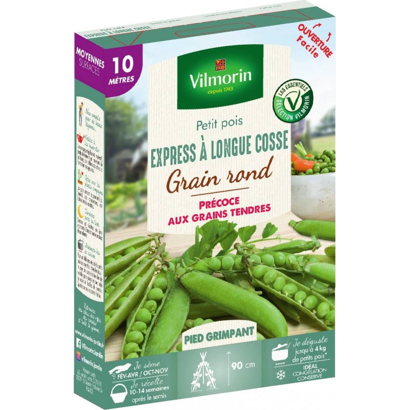 Cette variété hâtive, demi-grimpante, donne des cosses longues et courbées de 9-10 cm de longueur, contenant chacune 7 à 9 grains ronds et verts.Elle est bien adaptée aux cultures précoces.Les pois à grains ronds sont rustiques au froid et à l?humidité pendant la période de germination.Il est préférable de les récolter jeunes, lorsqu'ils sont bien tendres.Cette boîte contient la juste dose de graines pour semer 10 mètres linéaires de petits pois.|