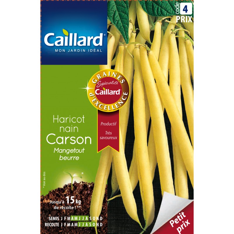 Remarquable variété productive et très savoureuse, donnant de très belles gousses sans fil, de 14-15 cm de longueur, droites et charnues, de coloration jaune intense. Variété résistante aux maladies classiques des haricots. Grain blanc.|