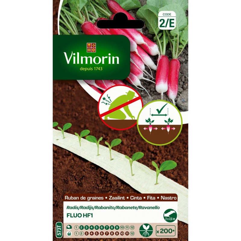 Ruban de graines biodégradable. Variété écarlate à bout blanc, issue de la recherche Vilmorin, alliant toutes les qualités que l'on peut souhaiter : précoce, croquant, savoureux et non piquant. Permet de semer 5 mètres linéaires.|