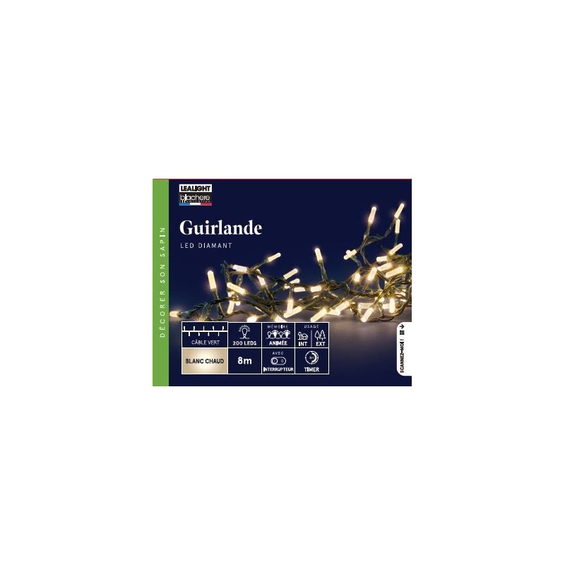 Guirlande Flicker Light®Led Diamant Blanc Chaud Câble Vert 24W Clignotant/Pour Intérieur Et Extérieur 8M-200L-BLACHERE
