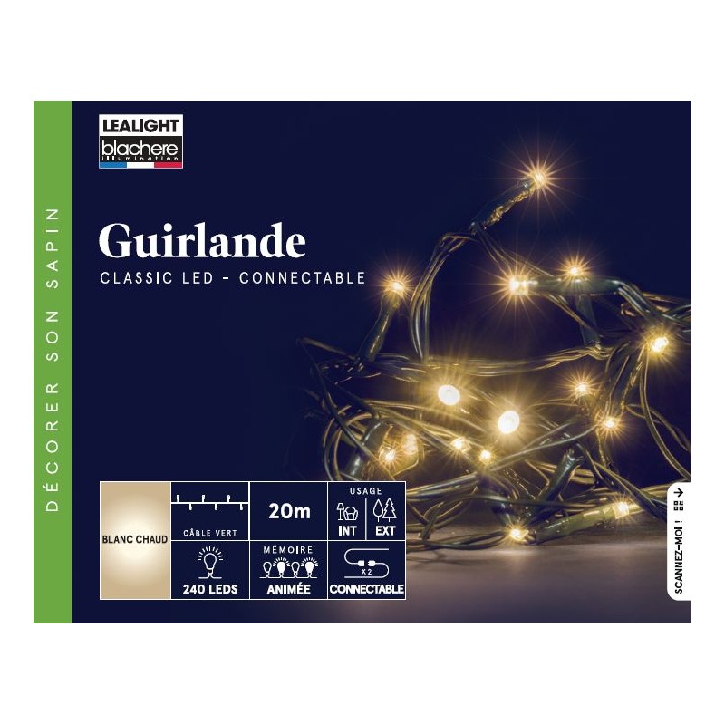 Créez une ambiance chaleureuse avec la guirlande Flicker Light® LED connectable de 20 mètres en blanc chaud. Elle comprend 240 LED fixes et propose 8 animations mémorisées. Adaptée à un usage intérieur et extérieur, cette guirlande est raccordable jusqu’à 2 fois pour une décoration étendue et uniforme.|