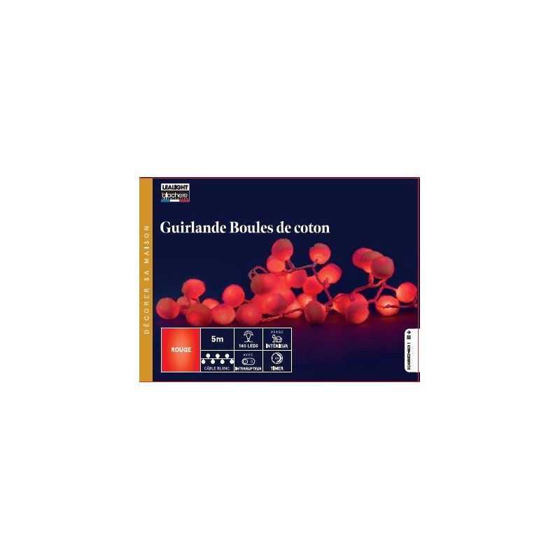 Guirlande Boules De Coton Led Rouge Câble Blanc 24W Fixe/Pour Intérieur 5M-140L-BLACHERE