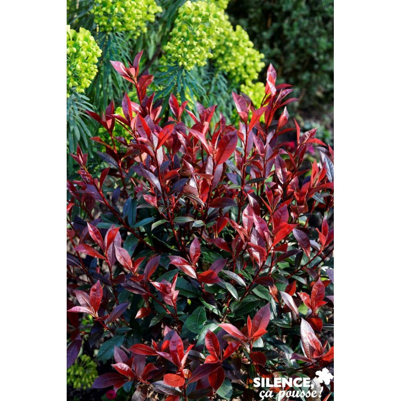 Photinia vigoureux, compact et dense. Feuillage persistant vert, jeunes pousses rouge vif.