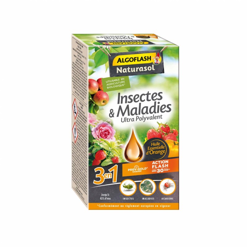 Traitement total triple action (insecticide, fongicide et acaricide) ULTRA Polyvalent avec plus de 75 usages homologués. Formulation concentrée à base d'huile essentielle d'orange douce extraite des fruits de Citrus sinensis, principe actif naturel et Utilisable en Agriculture Biologique. Efficace dès l'application contre mildiou, oidïum, rouille, taches noires et brunes ainsi que sur pucerons, cochenilles, pyrales du buis, aleurodes et acariens. Action FLASH, résultats visibles en quelques minutes sur les insectes ! Sa polyvalence d'usages permet de protéger les cultures ornementales, légumières et fruitières, rosiers, et arbres et arbustes. Agit par contact en provoquant le dessèchement de l'insecte, ainsi que des organes externes des maladies fongiques. La dessiccation des mycéliums et du tissu foliaire infecté environnant empêche la propagation de la maladie.|MENTIONS OBLIGATOIRES: