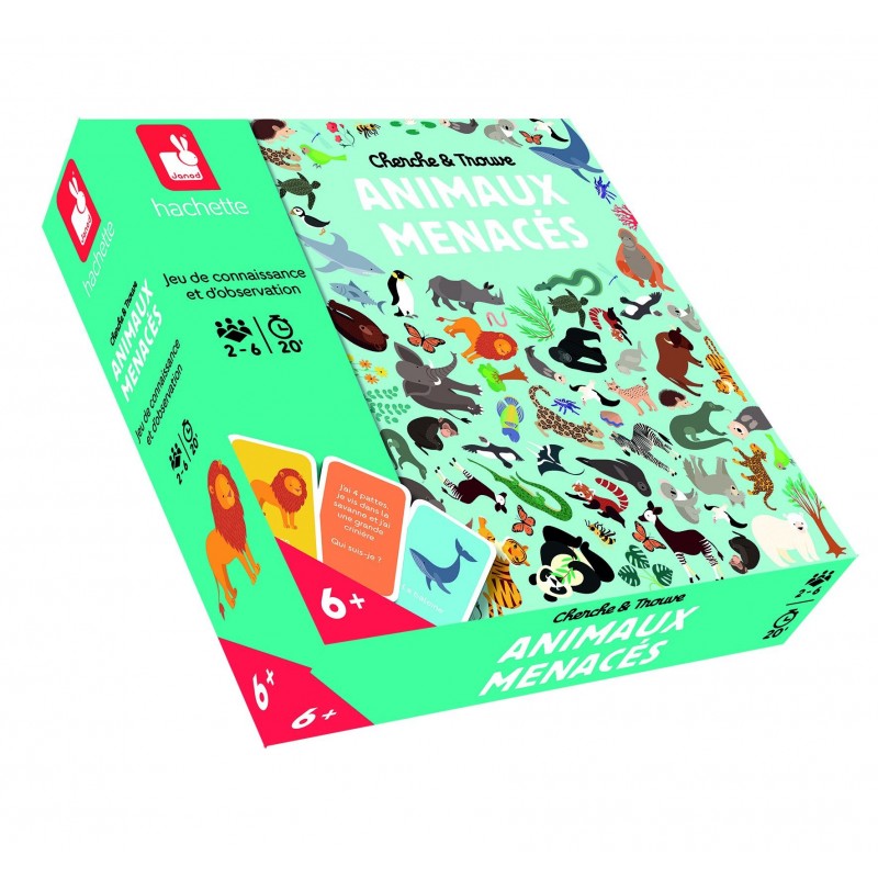Un jeu collaboratif pour découvrir les animaux menacés de notre belle planète. Pioche une carte, lis la devinette et trouve un animal. Retourne la carte, vérifie la réponse et découvre la fiche d?identité de l'animal ainsi que le nombre de fois où il apparait sur le plateau. Plus l'animal est menacé, moins il apparait sur le plateau. Il ne reste plus qu'à le chercher avant que le sablier ne soit écoulé. Contenu : 50 cartes, 1 plateau de jeu modulable, 8 jetons, 1 sablier. De 1 à 6 joueurs. Règles du jeu uniquement en français. Boite cloche