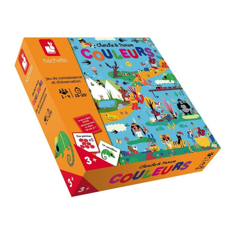 Un jeu évolutif d'observation pour apprendre les couleurs et commencer à compter. Pioche une carte, trouve l'élément grâce à la devinette et cherche-le sur le plateau ! 1 plateau de jeu double face, 80 cartes, 8 jetons règles du jeu uniquement en français. De 1 à 4 joueurs. A partir de 3 ans.