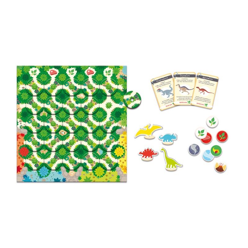 Fraye-toi un chemin jusqu’aux réserves de nourriture et rapporte assez de viande ou de plantes pour rassasier tes dinosaures. Mais attention, ne te trompe pas de nourriture ! Fais-toi aider par le T-Rex pour faire fuir tes adversaires et remporter la partie ! Une partie dure environ 20 minutes. Ce jeu se compose d’un plateau avec 25 roues amovibles, 5 pions dinosaures, 18 jetons nourriture, 10 jetons évènements et 30 cartes dinosaures. Il permet de développer le sens de l'observation, l’anticipation, la logique et d'acquérir des connaissances sur les dinosaures du Jurassique et du Crétacé. Uniquement en français. Idéal pour les enfants à partir de 8 ans. De 2 à 4 joueurs.