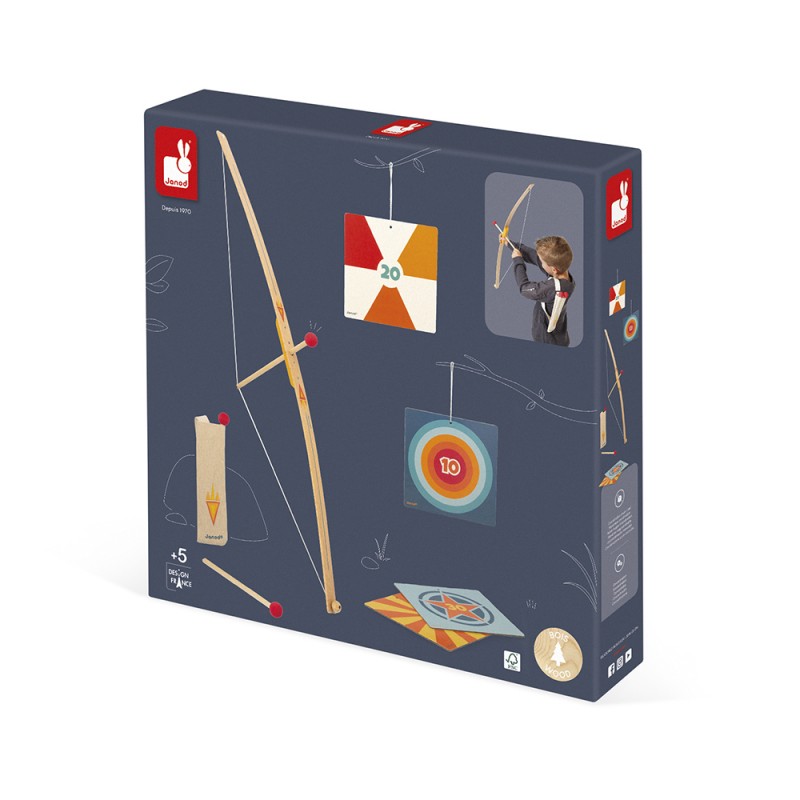 Pile dans le mile ! Votre enfant va devenir un petit champion du tir à l’arc ! Pour s’entraîner, il peut utiliser cet arc en bois avec ses 3 flèches dont l’embout est en mousse pour plus de sécurité, et ses 4 cibles en carton. Les flèches se rangent dans un joli carquois en tissu muni d’une sangle pour le porter à l’épaule. Livré avec 4 lacets pour suspendre les cibles. Jouet d’imitation en bois FSCTM pour les enfants à partir de 3 ans.