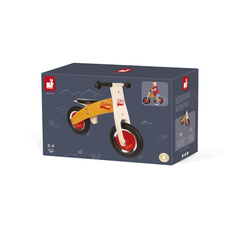La première draisienne en bois pour les tout petits, idéale pour maîtriser son équilibre et apprendre plus facilement à faire du vélo sans les roulettes. Pneus gonflables. Selle réglable en hauteur de 32 à 35 cm. Assise ultra confortable. Charge maximum : 30 kg. Bois : contreplaqué de tilleuil. Assise en PU et poignées en caoutchouc. Pack = boite couleur avec poignée plastique