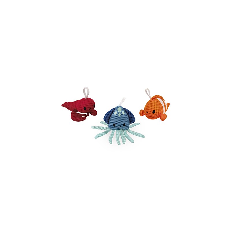 Accompagnez votre enfant vers l’autonomie avec ces jolies éponges de bain ! Cet assortiment se compose de 3 animaux marins : un homard, un poisson clown et un calamar. Il vous suffit de les mouiller et d’ajouter un peu de savon pour les faire mousser. Adaptées aux mains des plus petits, les éponges de bain vous permettront d’apprendre à votre enfant à se laver seul tout en s’amusant. Jouet pour le bain pour les enfants à partir de 10 mois.