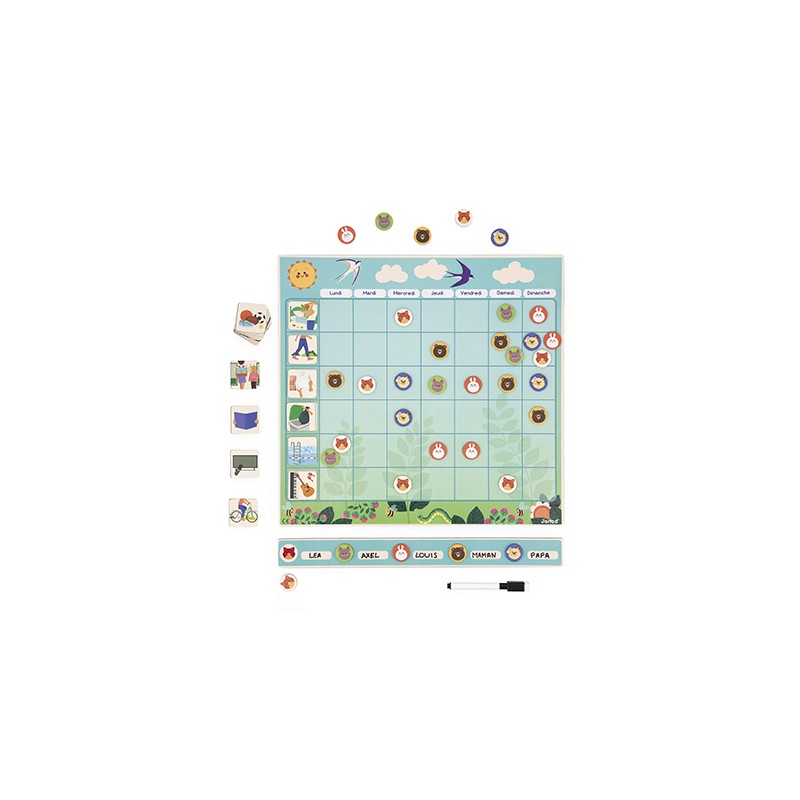L’organisation de la famille devient un jeu d’enfant avec ce tableau d’organisation magnétique. Il va permettre à votre enfant de facilement se repérer dans la semaine et d’acquérir de l’autonomie. Ainsi, plus jamais il n’oubliera qui vient le chercher à l’école ou quel jour il va au sport. Chaque jour et en face de chaque activité l’enfant pourra disposer le magnet de l’animal qui représente le ou les membres de la famille qui participeront à cette activité. Pour cela, le set est composé de 5 animaux présents en 11 exemplaires chacun, de 7 stickers en 6 langues pour les jours de la semaine et de 20 magnets activités allant des tâches ménagères simples, aux loisirs, en passant par le sport, la musique et les anniversaires, sans oublier la sortie de l’école. Un feutre effaçable est inclus pour écrire le nom de chaque personne sur la zone prévue à cet effet. Cet organisateur, est idéal pour accompagner votre enfant dans l’apprentissage de la notion du temps et de la vie quotidienne. Jouet en carton pour les enfants à partir de 3 ans.