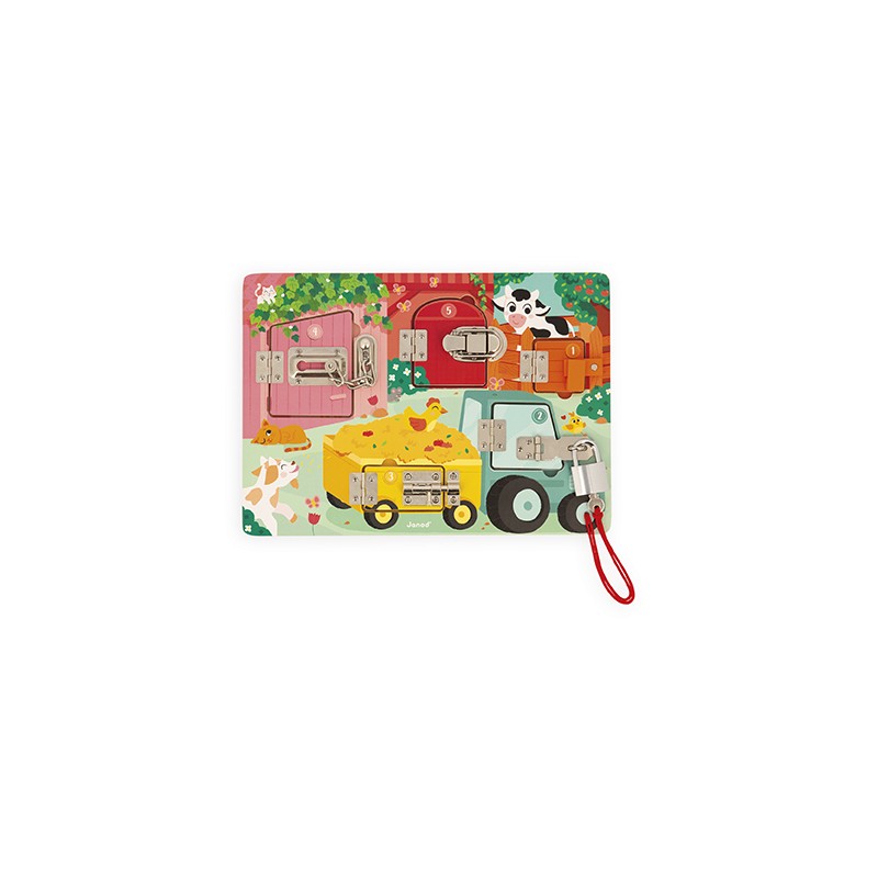 Toc toc toc ! Mais qui se cache derrière la porte de la grange ? Cette jolie planche à cadenas illustre le quotidien des animaux de la ferme et de leurs petits. Elle se compose de 5 portes avec des systèmes d’ouverture différents : une clé, un loquet, un entrebâilleur à chaine, une attache à bascule et un verrou. Chaque porte est représentée par une couleur et un chiffre différent. Surprise ! Ce chiffre est égal au nombre de bébés animaux cachés derrière la porte. Ce joli jouet en bois permettra à votre enfant de développer sa dextérité tout en apprenant les couleurs, les chiffres et les animaux. Parfait pour passer un moment ludique et amusant au coeur de la ferme ! Jouet en bois FSCTM. Jouet de manipulation pour les enfants à partir de 3 ans.