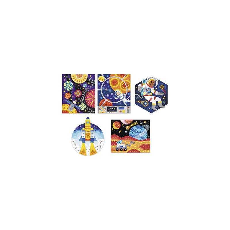 Pars à la découverte de l'espace ! Ce coffret est composé de 5 tableaux, dont deux en forme de fusée et de spationaute, à décorer avec plus de 1550 mosaïques pailletées, métallisées ou mat, grâce au livret d'instructions inclus. Il faut environ 3h pour réaliser les tableaux. Cette activité développe la motricité fine et la concentration. Idéale pour les enfants à partir de 7 ans.