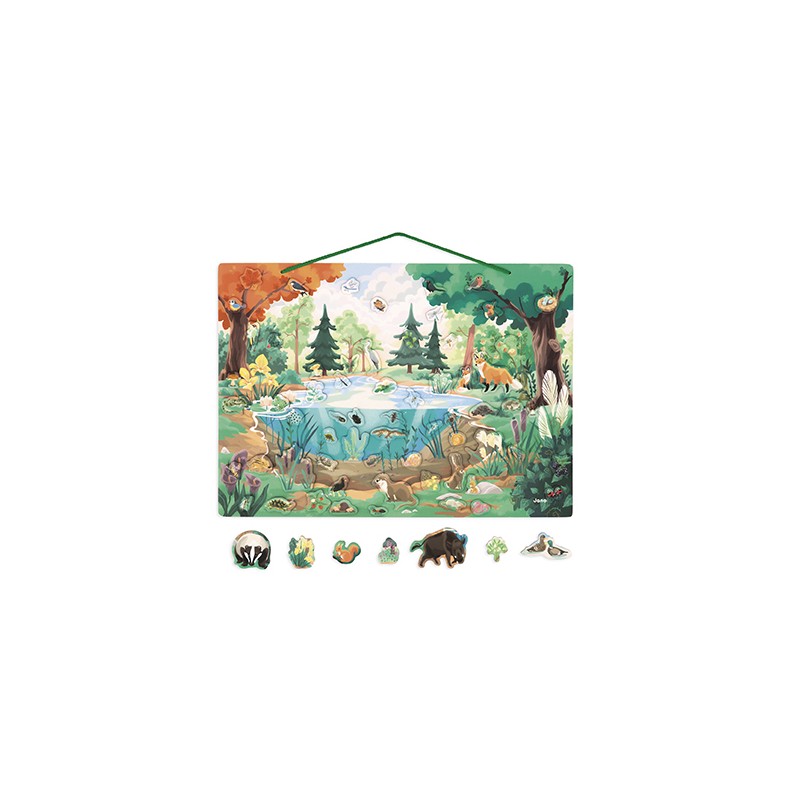 Grâce à ce tableau magnétique sur le thème de la mare et de la forêt votre enfant va pouvoir s'amuser tout en apprenant à identifier les différents habitants des sous-bois.70 magnets d'espèces animales et végétales composent ce tableau. À l'intérieur également, un poster éducatif recto/verso avec les noms de la flore et de la faune est inclus. Pratique ! Ce tableau magnétique peut se mettre sur une table, ou suspendu dans une chambre grâce à sa corde en tissu. Jouet éducatif magnetique en bois et carton FSCTM. Pour les enfants à partir de 5 ans.