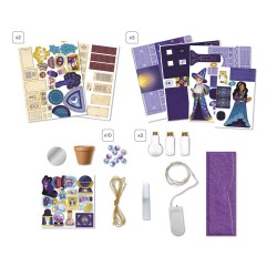 Construis ton atelier de sorciers ! Ce kit créatif permet de fabriquer un véritable atelier de sorciers en format miniature directement dans la boîte. Ce petit univers est à assembler et à coller puis à décorer avec une guirlande lumineuse. Une fois terminé, on peut aussi jouer avec grâce aux personnages fournis. Il contient 5 planches de carton prédécoupées, 2 feuilles de papier prédécoupé, 1 planche de feutrine prédécoupée, 1 tube de colle, 1 guirlande lumineuse (piles incluses), 3 fioles en verre, 1 miroir autocollant, des perles nacrées, de la ficelle dorée, 1 pot en terre-cuite et 1 livret avec les instructions et les modèles. Cette activité permet de développer sa patience et sa dextérité et nécessite environ 2h. Elle est idéale pour les enfants à partir de 8 ans.