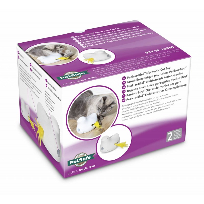 Grâce au jouet électronique Peek-a-Bird™, les chats passent des heures captivantes à s’amuser avec une plume. Ce jouet comporte deux modes différents qui sollicitent le chat et le font jouer tout au long de la journée. En mode « Jouer une seule fois », le jouet s’active pendant 10 minutes et s’éteint ensuite automatiquement pour économiser les piles. En mode « Jeu en continu », le jouet s’active pendant 10 minutes et se coupe durant 2 heures avant de se rallumer. Lors des 2 heures de repos, si le détecteur perçoit un mouvement du chat, il se rallume automatiquement. Ces sessions de jeu spontanées divertissent le chat en l’absence de son maître. Le jouet est doté d’un casse-tête à plume et est fourni avec une plume de remplacement pour que le chat profite d’innombrables parties de chasse endiablées.