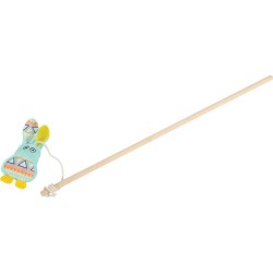 Jouet canne à pêche pour chat. Cette canne à pêche est dotée d'un manche en bambou et d'une figurine en forme de lapin, fabriquée en tissu polyester imprimé avec motifs ethniques. La figurine contient de l'herbe à chat et du papier bruissant.|