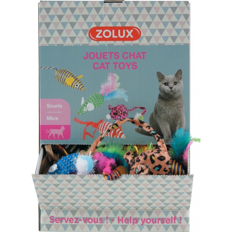 Les jouets incontournables pour chat!Display souris: 4 modèles de souris avec des formes, des couleurs et des matières variées.Displays prêts à vendre: moins d'emballages, moins de déchets.Chaque jouet est stické avec un gencod pour le passage en caisse.|