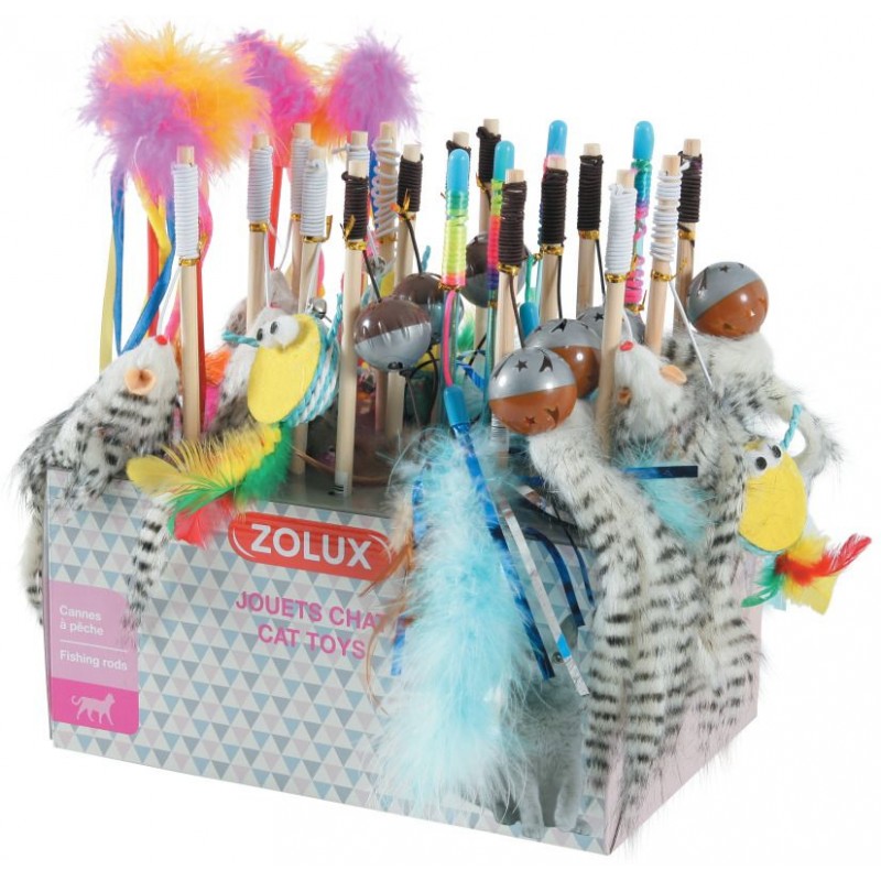 Les jouets incontournables pour chat!Display cannes à pêche: 6 modèles, dont 3 très colorés et 3 aux teintes naturelles avec manche en bois.Displays prêts à vendre: moins d'emballages, moins de déchets.Chaque jouet est stické avec un gencod pour le passage en caisse.|