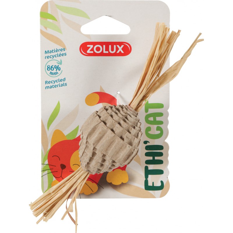 Jouet éco-conçus pour chats ETHI'CAT. Jouet en forme de balle en carton recyclé. Fabriqué à partir de 86% minimum de matières recyclées (dont carton recyclé et polyester recyclé).|