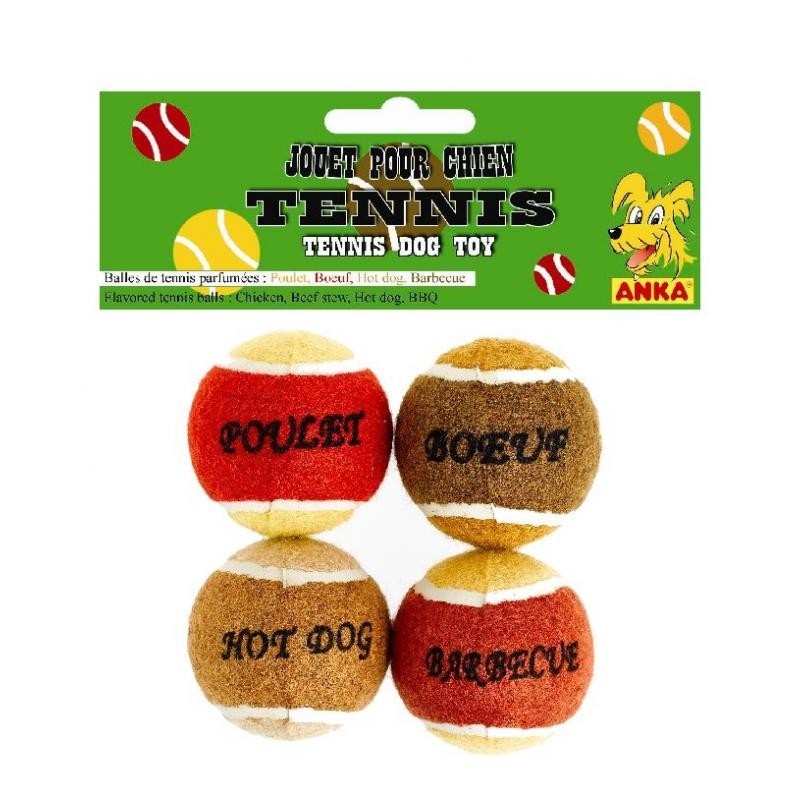 Jouet - lot de 4 balles tennis parfumées : boeuf/poulet/hot dog/barbecue