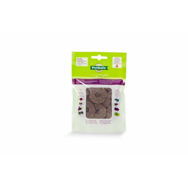Ces friandises en cuir naturel (peau de vache) se placent sur les jouets PetSafe® pour que le chien puisse mastiquer, jouer et augmenter le plaisir du jeu. Chaque paquet contient 16 friandises circulaires. La taille A est adaptée aux jouets XS et S. La taille B est adaptée aux jouets S et M. La taille C est adaptée aux jouets M/L et L.