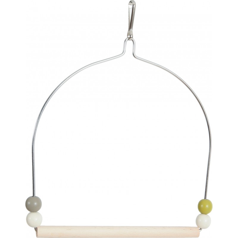 Balancoire bois avec cadre en fer. Non toxique : peinture conforme aux normes alimentaires (Norme EN71-3). Coloris tendances : vert olive, taupe et beige, en adéquation avec les cages et volières arabesque.
