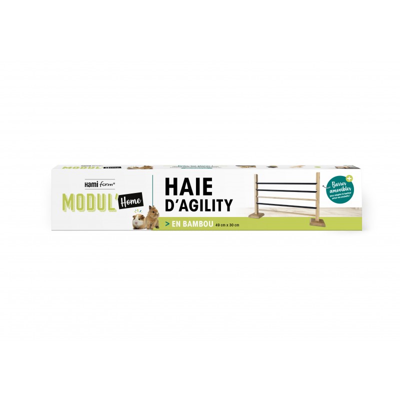 Haie d'agility en bambou La haie d'agility en bambou Modul'home vous offrira de vrais de moments de complicité avec votre animal ! Les lapins particulièrement excellents dans le saut d'obstacle … À vous de l'accompagner dans ses pauses récréatives. La haie s'installe facilement, en quelques secondes. Adaptez la hauteur à votre animal.|