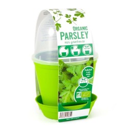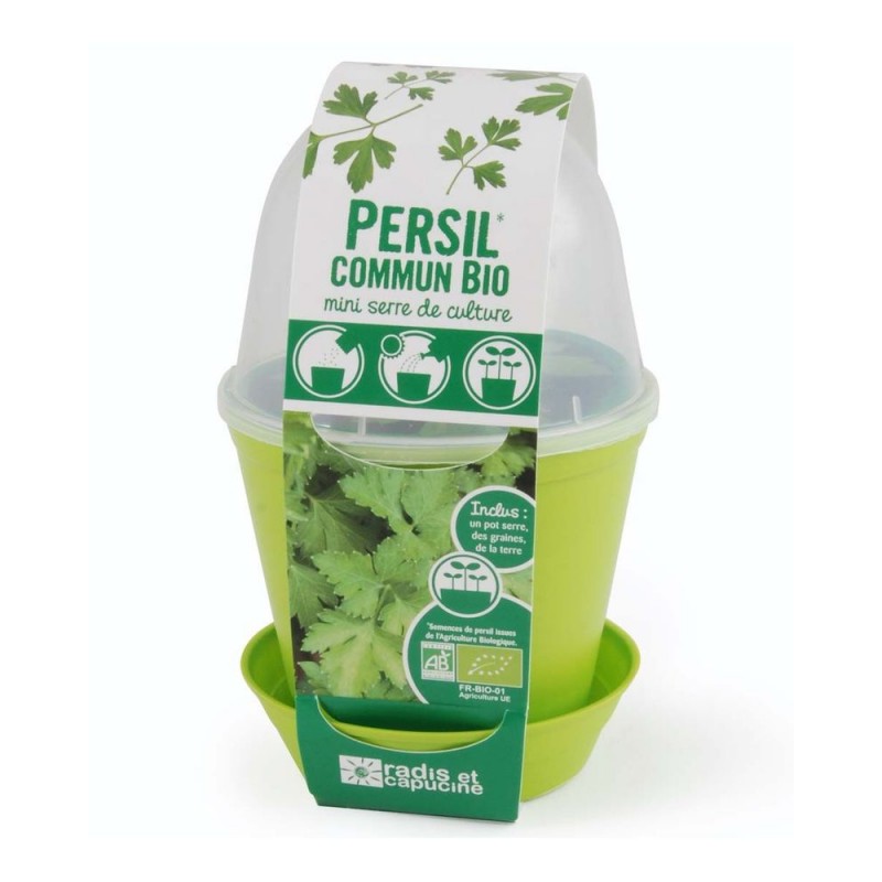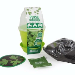 Le kit de semis se compose d’un pot de matière plastique de 12 cm et de sa coupelle assortie, d’un sac de terreau et d’un sachet de graines de persil 'Commun’ à feuille plate issues de l’agriculture biologique.