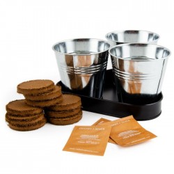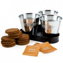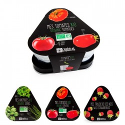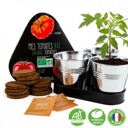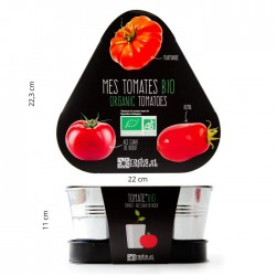 Les tomates anciennes ont la faveur des amateurs de vrais goûts retrouvés en cuisine. Les faire pousser est encore plus gratifiant et lorsque le jardinage se teinte d'élégance, cela donne ce trio de pots zinc présenté sur un plateau noir. Ils contiennent le nécessaire pour semer et faire pousser des plants de Marmande, de Roma et d'Ace chair de bœuf. Les 3 variétés son bio.