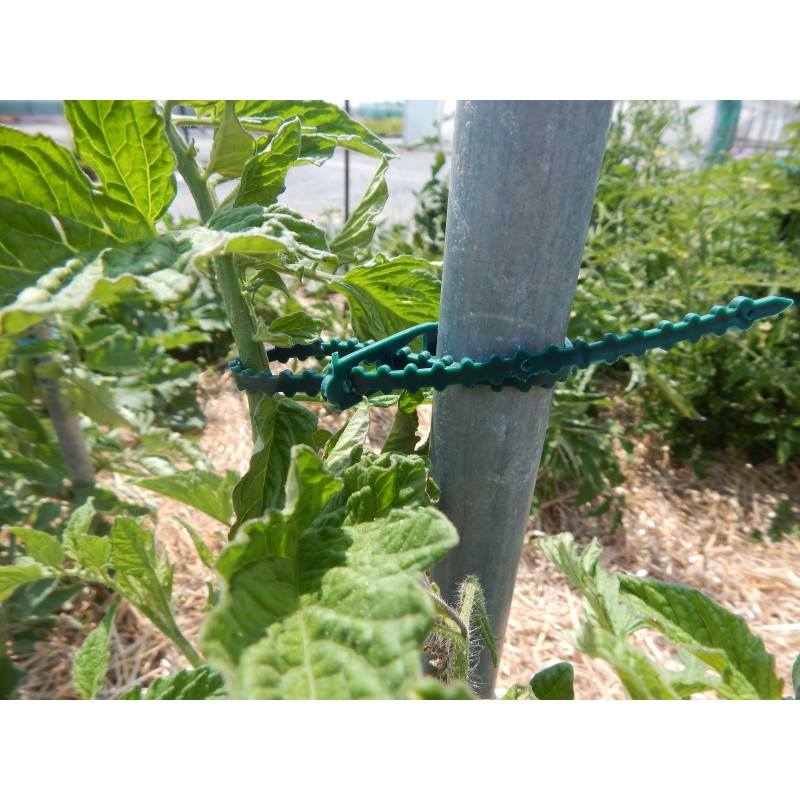 En polyéthylène souple, plastique recyclable. S'adapte à tout diamètre de tige ou tuteur. Cranté sur toute la longueur