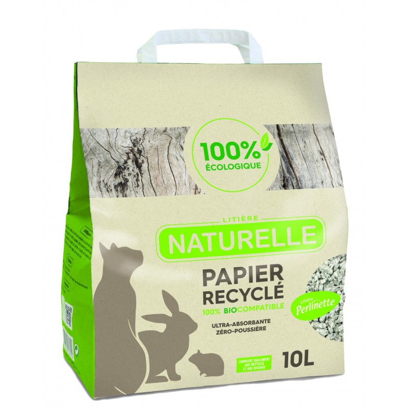 La litière Perlinette en papier recyclé pour chat, lapin, cobaye et oiseau est naturelle et 100% bio-compatible.