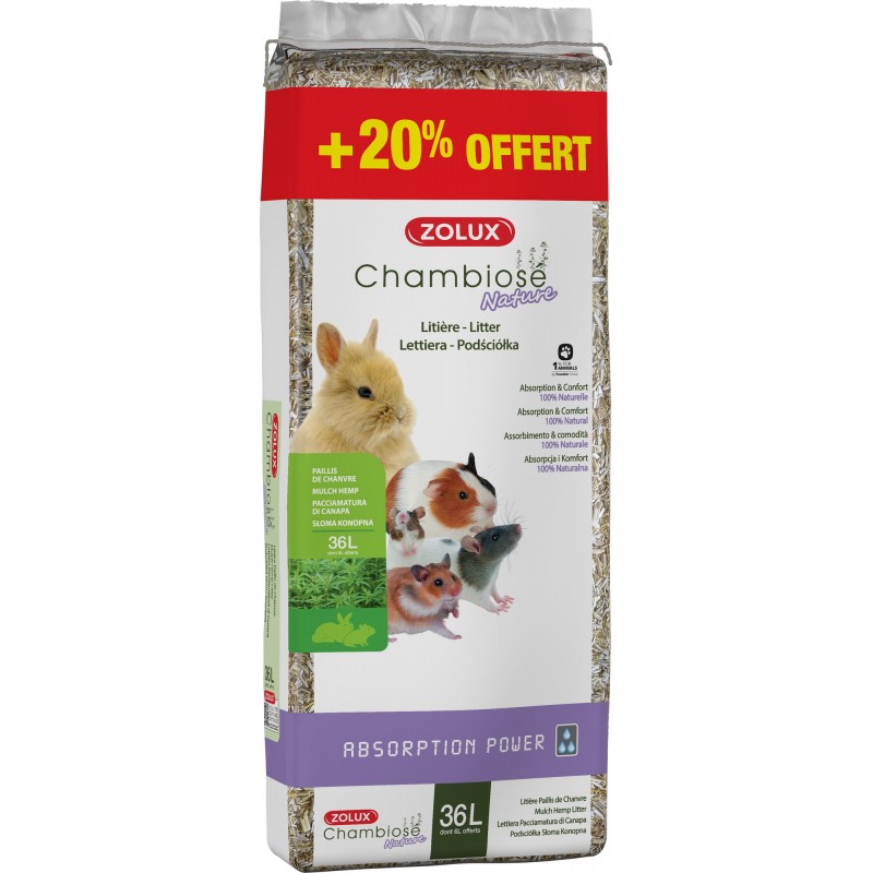 Litière Chambiose est une litière végétale 100% naturelle (paillis de chanvre), biodégradable et compostable. Le paillis de chanvre constitue une litière confortable et efficace par sa souplesse et son pouvoir absorbant. Elle peut également être combinée avec un autre matériau à très fort pouvoir absorbant pour encore plus d'efficacité. Plusieurs formats disponible: 10L, 30L, 60L, 100L et 200L.|