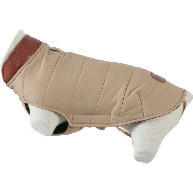 Doudoune London. Le look citadin tendance. Cette doudoune matelassée et imperméable est à la fois actuelle et très confortable. Ajustable au niveau du col et du poitrail grâce aux scratchs et aux élastiques. Passe-laisse et passe-pattes intégrés ton sur ton. Empiècement en cuir synthétique couleur cognac, cousu avec marquage DOG. Matières: dessus 100% nylon recyclé - intérieur et rembourrage: 100% polyester recyclé. Coloris: beige. 7 tailles disponibles: 25cm, 30cm, 35cm, 40cm, 45cm, 50cm et 55cm. Conçu dans une démarche écoresponsable: nous avons porté une attention particulière au choix des tissus utlisés en privilégiant des matières recyclées. Les sachets plastiques qui recouvrent nos produits sont en plastique recyclé. Comment choisir la bonne taille de pull? Mesurez la longueur du dos de votre chien en partant de la base du cou jusqu'à la naissance de la queue et reportez vous aux indications ci dessous: Longueur du dos < 25cm = T25. Longueur du dos comprise entre 25 et 30cm = T30. Longueur du dos comprise entre 30 et 35cm = T35. Longueur du dos comprise entre 35 et 40cm = T40. Longueur du dos comprise entre 40 et 45cm = T45. Longueur du dos comprise entre 45 et 50cm = T50. Longueur du dos comprise entre 50 et 55cm = T55. A titre d'information complémentaire la taille 25 correspond généralement à des chiens de types Chihuahua, Pinsher Nain, Yorkshire. La taille 30 correspond à des chiens de types Bichon maltais, Caniche Toy, Pékinois, Schnauzer nain. La taille 35 correspond à des chiens de types Carlin, Cavalier King Charles, Jack Russel, Shih Tzu, Westie. La taille 40 correspond à des chiens de types Bouledogue français, Caniche, Cocker, Lhassa Apso. La Taille 45 correspond à des chiens de types bouledogue anglais, cocker américain ou encore Fox terrier. La Taille 50 correspond à des chiens de types cocker américain, bouledogue anglais, cocker anglais. La Taille 55 correspond à des chiens de types husky, boxer, dalmatien, labrador. Ces données sont indicatives. Chaque animal est unique, il est donc nécessaire de prendre en compte ses particularités de poids et/ou de taille.|