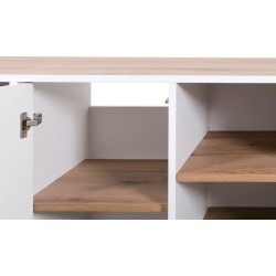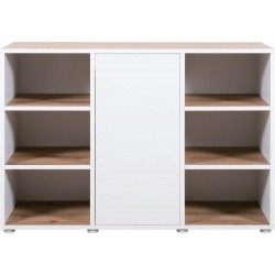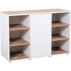 Astucieux, il est personnalisable grâce à ses tablettes réversibles: les champs sont de couleur différente, un côté blanc et l'autre couleur chêne.. La tablette située derrière la porte du meuble est réglable sur 3 hauteurs. Elle est également plus courte et adaptée pour laisser passer les tuyaux du filtre extérieur.|