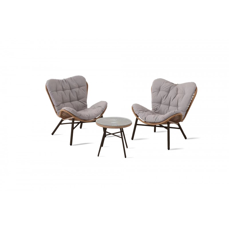 Ensemble bas 3 pièces structure acier - résine tressée Ø 9 mm et plate 7,12 mm. Coussins spunpolyester. Plateau en verre transparent .Epatez vos invités avec ce salon d'extérieur en résine tressée SET MAISO, comprenant 2 fauteuils et une table d'appoint.