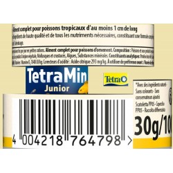 TetraMin Junior est un mini-aliment complet et biologiquement équilibré pour l'alimentation quotidienne de jeunes ou de petits poissons d'ornement mesurant plus de 1 cm de long. Ce mélange soigneusement sélectionné contient des nutriments fonctionnels de haute qualité ainsi que des vitamines, des minéraux et des oligo-éléments essentiels. Cette formule contient également des prébiotiques qui contribuent à améliorer les fonctions corporelles des poissons et l'assimilation des aliments. Cette recette unique, à base d'ingrédients naturels de haute qualité, sans colorants ni conservateurs ajoutés, propose un régime complet qui contribue à stimuler une croissance saine au cours de l'alevinage. Cet aliment contribue à favoriser la résistance de vos poissons et à améliorer la qualité de l'eau. Avec TetraMin Junior, vos poissons d'ornement s'épanouiront et l'eau de votre aquarium restera propre et claire.|