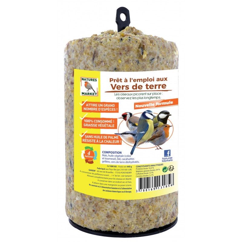 DESCRIPTION: Graisse 100% VEGETALE 440grs. Mangeoire prête à l'emploi: cylindre sur support en plastique a suspendre