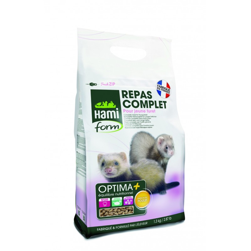 Les furets apprennent très jeunes (par l'odeur) le type de nourriture qui leur convient. Hami form spécial jeunes furet a été formulé par nos nutritionnistes pour répondre aux besoins élevés en nutriments des jeunes furets. Le jeune furet, comme tous les carnivores stricts, ne mâche pas sa nourriture, il la coupe avec ses dents dites "carnassière" et l'avale. Le dessin de la croquette et sa taille ont été optimisé pour s'adapter à la machoire des jeunes furets. Plus facile à macher et plus digeste, elle favorise le développement et la croissance de votre animal.