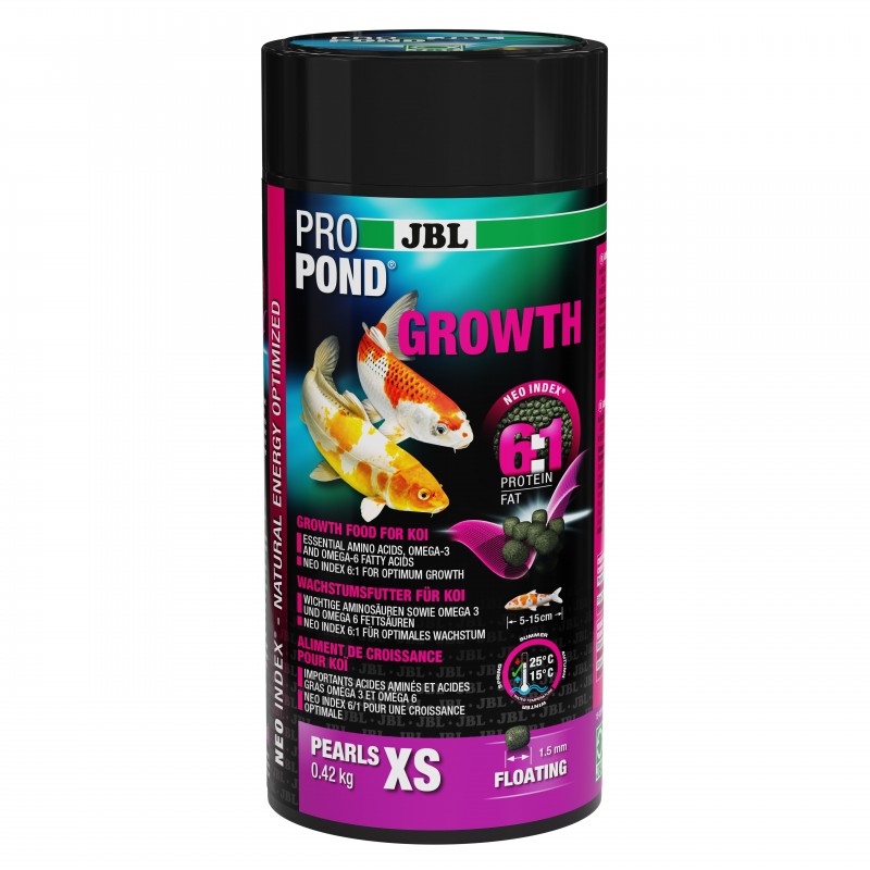 Aliment spécial croissance pour très petits koïs. Bon rapport protéines-lipides 6/1 d'après NEO Index (selon température, fonction, taille et de l'âge de l'animal). Contient saumon, crevettes, spiruline, huile de poisson pour une croissance optimale (temp. de l'eau 15-25 °C). Aliment de taille XS (1,5 mm) pour poissons de 5 à 15 cm. Perles flottantes contenant 52 % de protéines, 9 % de lipides, 2 % de fibres brutes et 10 % de cendres brutes. Perles alimentaires en boîte refermable, étanche à l'air, à l'eau et à la lumière pour conserver leur qualité|