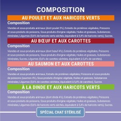 COMPOSITION: SAUMON: Viandes et sous-produits animaux, Extraits de protéines végétales, Poissons et sous-produits de poissons (saumon 4%), Sous-produits d'origine végétale, Huiles et graisses, Substances minérales, Légumes (0,6% de carottes séchées, équivalent à 5,4% de carottes), Sucres. DINDE: Viandes et sous-produits animaux (dont dinde 4%), Extraits de protéines végétales, Poissons et sous-produits de poissons, Sous-produits d'origine végétale, Huiles et graisses, Substances minérales, Légumes (0,6% de haricots verts séchés, équivalent à 5,4% de haricots verts), Sucres. POULET: Viandes et sous-produits animaux (dont poulet 5%), Extraits de protéines végétales, Poissons et sous-produits de poissons, Sous-produits d'origine végétale, Huiles et graisses, Substances minérales, Légumes (0,6% de haricots verts séchés, équivalent à 5,4% de haricots verts), Sucres. BOEUF: Viandes et sous-produits animaux (dont Boeuf 4%), Extraits de protéines végétales, Poissons et sous-produits de poissons, Sous-produits d'origine végétale, Huiles et graisses, Substances minérales, Sucres, Légumes (0,6% de carottes séchées, équivalent à 5,4% de carottes).