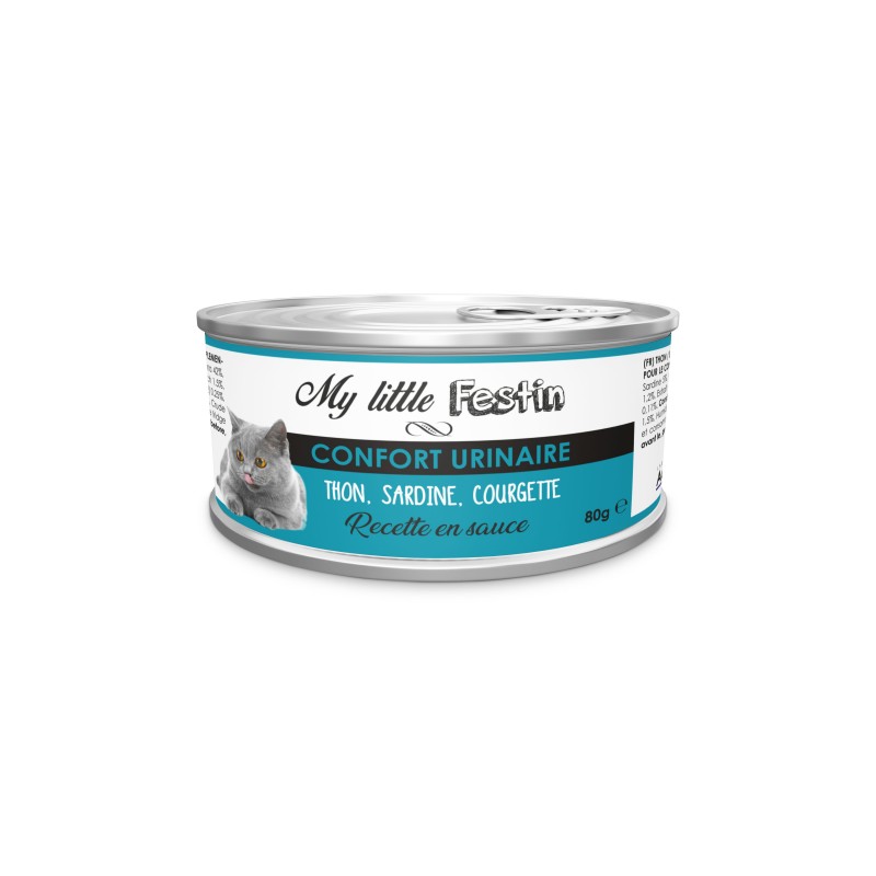 COMPOSITION: Thon 42%, Eau, Sardine 5%, Courgette 5%, Myrtilles 3%, Amidon de tapioca 1,5%, Farine d'os de thon 1,2%, Extrait de canneberge 1%.