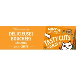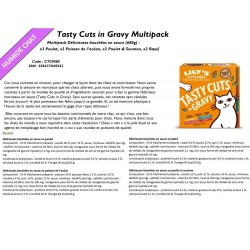 Délicieuses bouchées en sauce au Boeuf protéine brute 9,5 %, matières grasses brutes 4,5 %, cendres brutes 2 %, cellulose brute 0,1 %, humidité 82 %. Énergie 85 kcal/100 g.