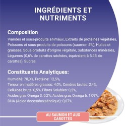 Spécialement formulé pour les chatons de 1 à 12 mois et les chattes en gestation ou en lactation avec du saumon de haute qualité, pour des protéines et un goût savoureux, et des carottes.