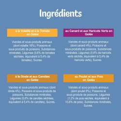 Canard et Haricots Verts: Viandes et sous-produits animaux (dont canard 4%), Poissons et sous-produits de poissons, Substances minérales, Légumes (0,6% de haricots verts séchés, équivalent à 5,4% de haricots verts), Sucres.