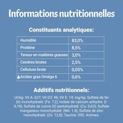 CONSTITUANTS ANALYTIQUES: Humidité: 83,0%, Protéine: 8,5%, Teneur en matières grasses: 3,0%, Cendres brutes: 2,5%, Cellulose brute: 0,05%, Acides gras Oméga 6: 0,6%.