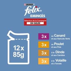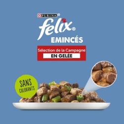Les chats futés savent ce qu'ils veulent, en particulier à l’heure des repas ! C'est pourquoi les recettes irrésistibles de FELIX® Emincés sont préparées avec des ingrédients de qualité et contiennent de tendres émincés enrobés d’une délicieuse gelée. Ces repas FELIX® Emincés sont une source d'acides gras essentiels Oméga 6 avec le juste équilibre de vitamines pour aider votre chat à rester en pleine forme et à être prêt pour encore plus de malice ! Ils sont préparés avec des ingrédients de qualité pour satisfaire 100% des besoins quotidiens de votre chat, selon les rations journalières recommandées sur l'emballage. Et ce n'est pas tout ! Les repas FELIX® sont disponibles dans une large gamme de recettes en gelée pour satisfaire les envies de variété de votre chat. FELIX®, tellement irrésistible !