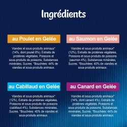 POULET: Viandes et sous-produits animaux* (14%, dont poulet 8%), Extraits de protéines végétales, Poissons et sous-produits de poissons, Substances minérales, Sucres. *Bouchées: 44% de viandes et sous-produits animaux.
