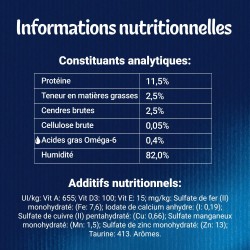 CONSTITUANTS ANALYTIQUES: Humidité: 82%, Protéine: 11,5%, Teneur en matières grasses: 2,5%, Cendres brutes: 2,5%, Cellulose brute: 0,05%, Acides gras Oméga-6: 0,4%
